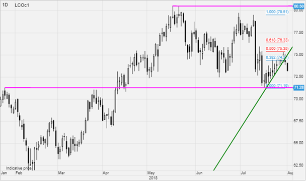 Ropa je po raste ceny v júli opäť na defenzívnej trajektórii. Tak WTI ako aj Brent sa obchodujú teraz v pásme a volatilitu v rámci neho spôsobuje najmä tradičné nízka letná likvidita trhu.
