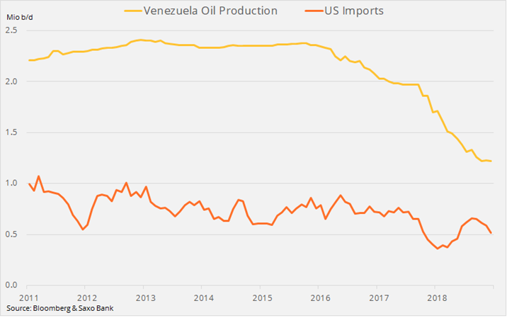 Politická a potenciálne vojenská škriepka Venezuely s USA by mohla viesť k ďalšiemu poklesu produkcie a súčasne k zvýšeniu geopolitického napätia, najmä vzhľadom na podporu, ktorú má N. Maduro v Moskve a Pekingu. V prípade ak by bol zbavený prezidentského mandátu, produkcia by sa vrátila na svoje predchádzajúce úrovne, dokonca ešte vyššie. USA môžu v krátkodobom horizonte reagovať na eskalovanú situáciu znížením dovozu venezuelskej ropy, v súčasnosti okolo 500 000 barelov / deň.