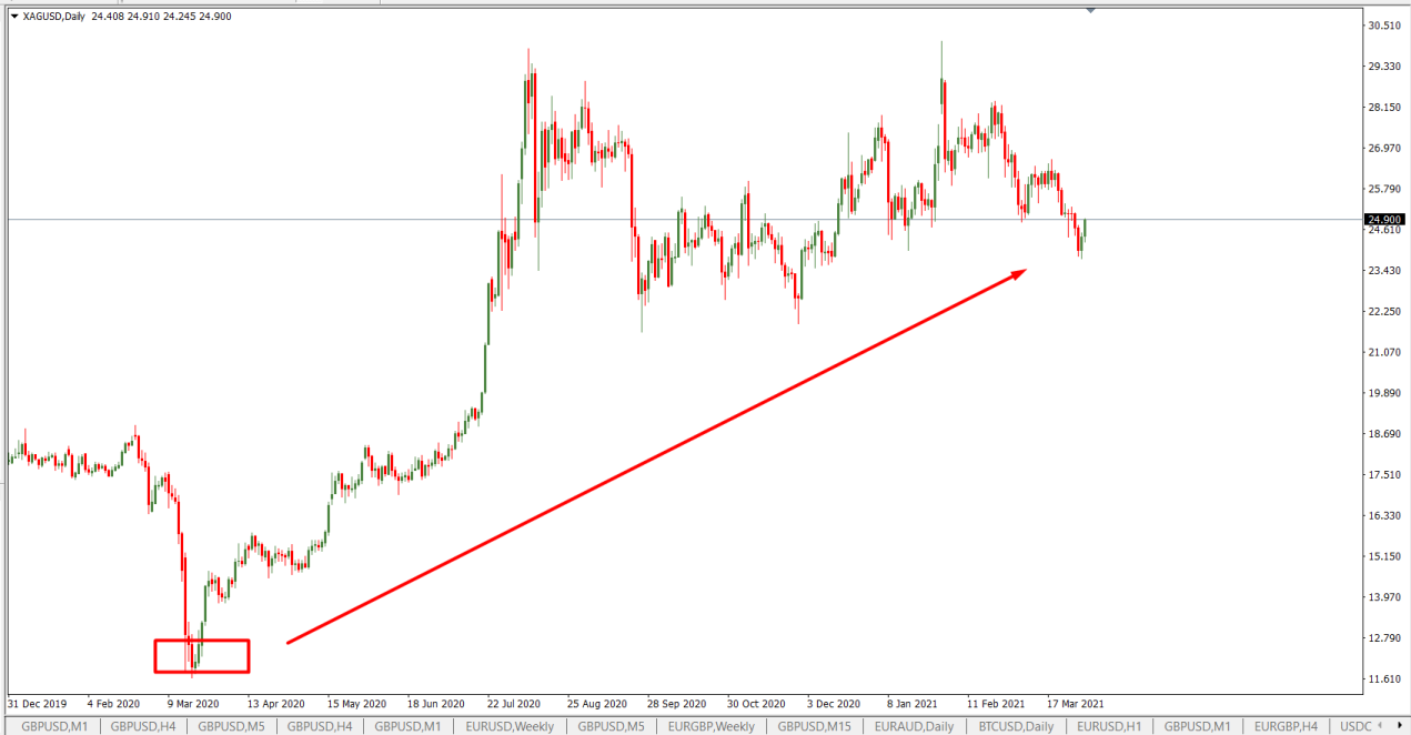 V marci 2020, v čase nástupu pandémie Covid-19, sa tento pomer dostal až na hodnotu 126, čo bolo najviac od roku 1971. Podľa vyššie uvedenej teórie nám to signalizovalo vhodný čas na nákup striebra. Nižšie sa pozrime na graf striebra.