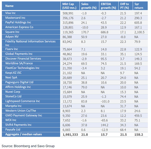 Pozoruhodnými spoločnosťami sú napríklad: Square, Stripe (obe vznikli v roku 2009), Klarna (2005), AfterPay (2014) – táto bola nedávno kúpená spoločnosťou Square za 29 mld. dolárov. Patrí sem aj holandská spoločnosť Adyen, ktorej tržby dosiahli v prvom polroku 445 miliónov dolárov, čo prekonalo odhady analytikov. Spoločnosť sa vezie na trende alternatívnych platieb v online priestore. Rástla aj vďaka pandémii, ktorá tento fenomén ešte umocnila. Spoločnosť očakáva, že v strednodobom horizonte bude dosahovať ročný nárast tržieb o 25 až 32 percent.
