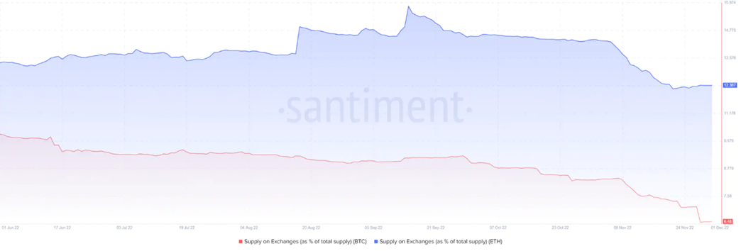Po „šokujúcom“ krachu kryptoburzy FTX kryptotrh okamžite zareagoval výberom finančných prostriedkov z búrz z obavy, že by sa insolventnými mohli stať aj ďalšie kryptoburzy. Len v novembri opustili trh takmer 2 % z celkovej ponuky bitcoinov a viac ako 2 % éterov. Týmto sa ethereum blíži k historickému minimu, pokiaľ ide o objem ponuky na burzách. „Teraz bude prípadný tlak na ďalšie predaje v krátkodobom horizonte menší než tomu bolo pred mesiacom. Jednoducho preto, že je menej pravdepodobné, že sa z búrz stiahnuté kryptomeny predajú,“ očakáva Mads Eberhardt, kryptoanalytik Saxo Bank.