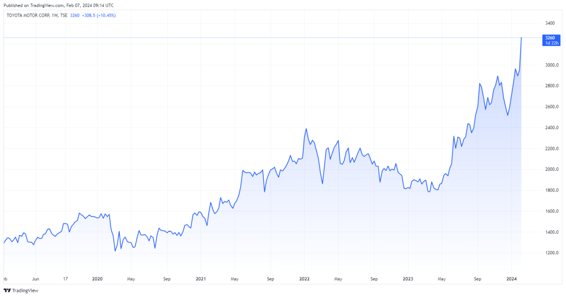 Akcie Toyoty od začiatku roka 2023 vzrástli o 80 % v porovnaní so 69 % nárastom akcií Hondy a 47 % nárastom Nissanu za rovnaké obdobie.