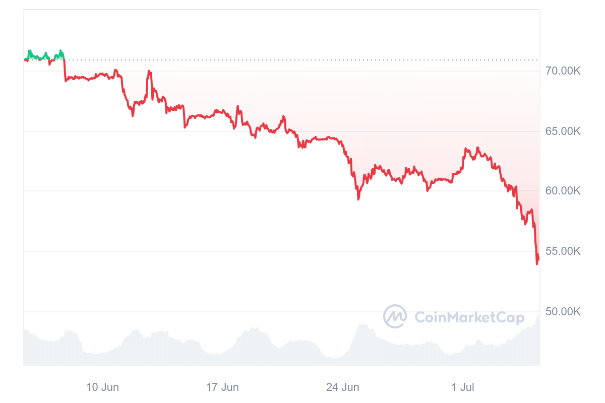 Na trhu s kryptomenami je v piatok poriadne rušno. Najväčšia kryptomena Bitcoin stráca približne 7 % na 54 300 USD, čo je najnižšia úroveň od februára. Za posledných 30 dní sa cena Bitcoinu prepadla o viac ako 23 %.