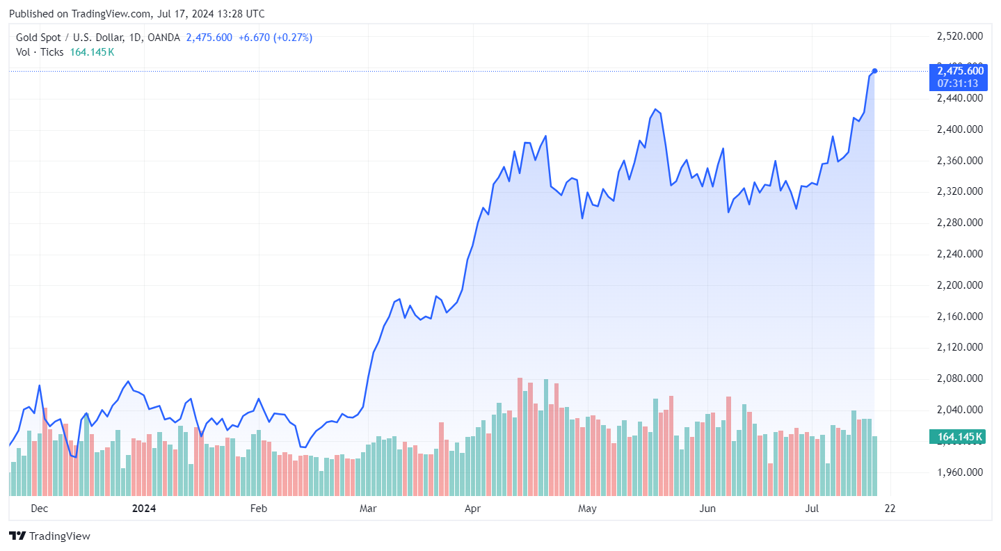 Zlato v stredu pokorilo nové maximum. Spotová cena zlata dnes vzrástla až na rekordných 2481 USD za trojskú uncu a zaznamenala tak nový rekord.