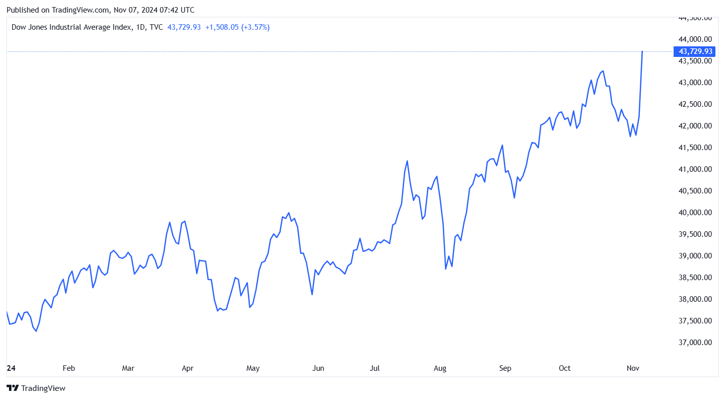 Akciový index Dow Jones poskočil o 3,5 % alebo o 1 508 bodov a uzavrel na rekordnej úrovni 43 729 bodov. Širší index S&P 500 vzrástol o približne 2,5 % a prekonal hranicu 5 900 bodov a technologický Nasdaq Composite posilnil o približne 2,9 % a tiež dosiahol nové rekordné maximum.