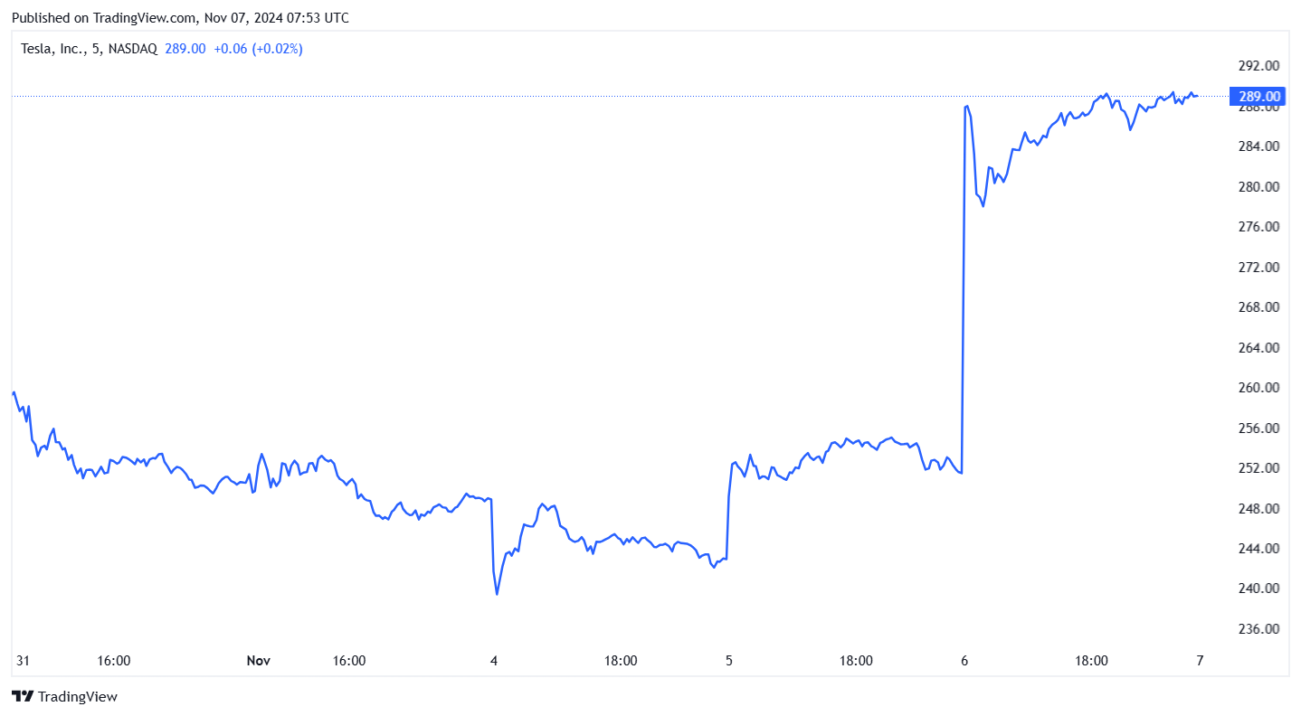 Akcie spoločnosti Tesla vzrástli o takmer 15 % vďaka stávkam investorov, že výrobca elektromobilov, ktorého vedie Elon Musk, bude mať z návratu Donalda Trumpa do prezidentského úradu veľký prospech. Očakáva sa, že generálny riaditeľ Tesly Elon Musk, ktorý otvorene podporuje Trumpa, sa stane významným poradcom prezidenta.