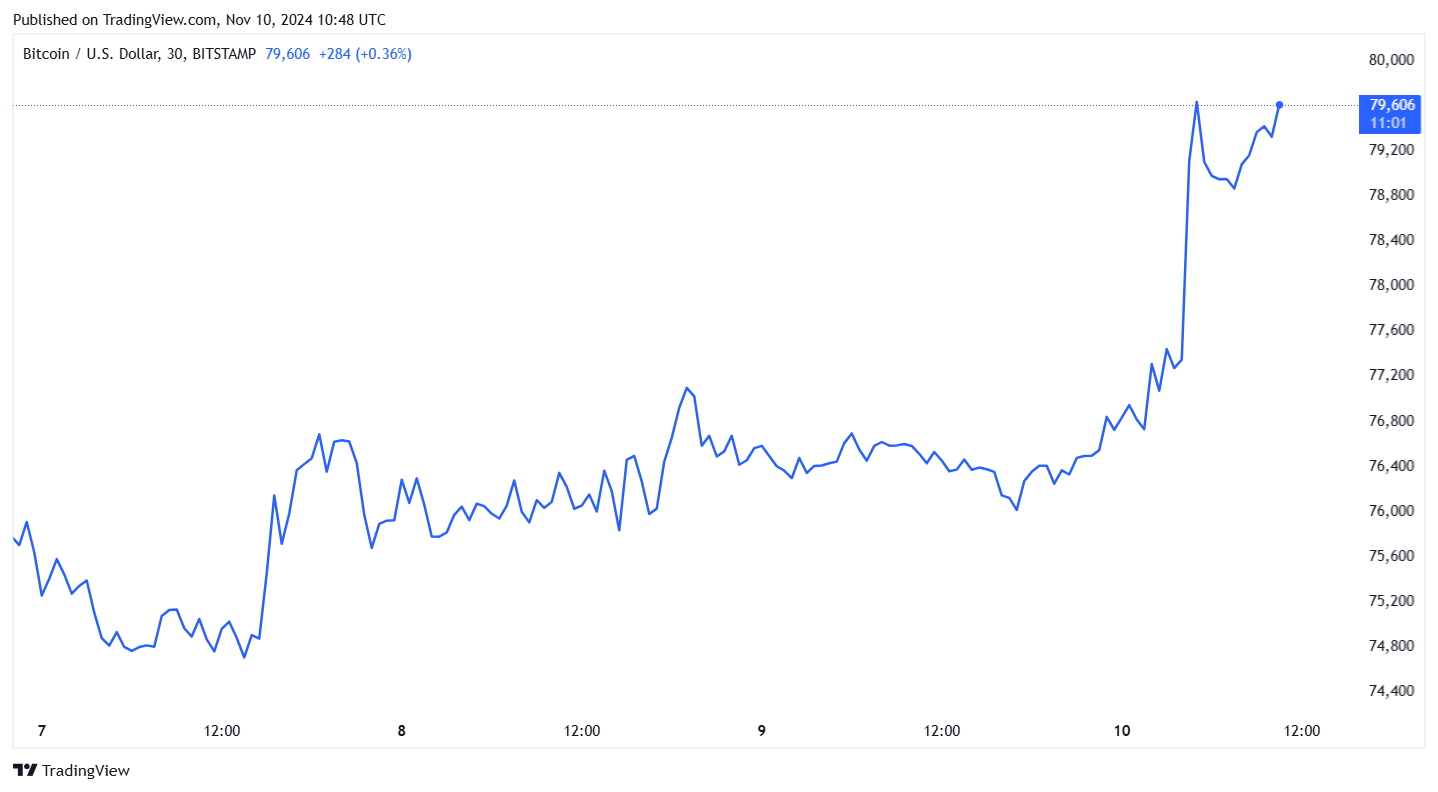 Počas dnešného dňa dosiahol bitcoin rekordné maximum 79 775 USD a aktuálne sa obchoduje na úrovni 79 606 dolárov. Za posledných 7 dní to predstavuje nárast o viac ako 16 %.