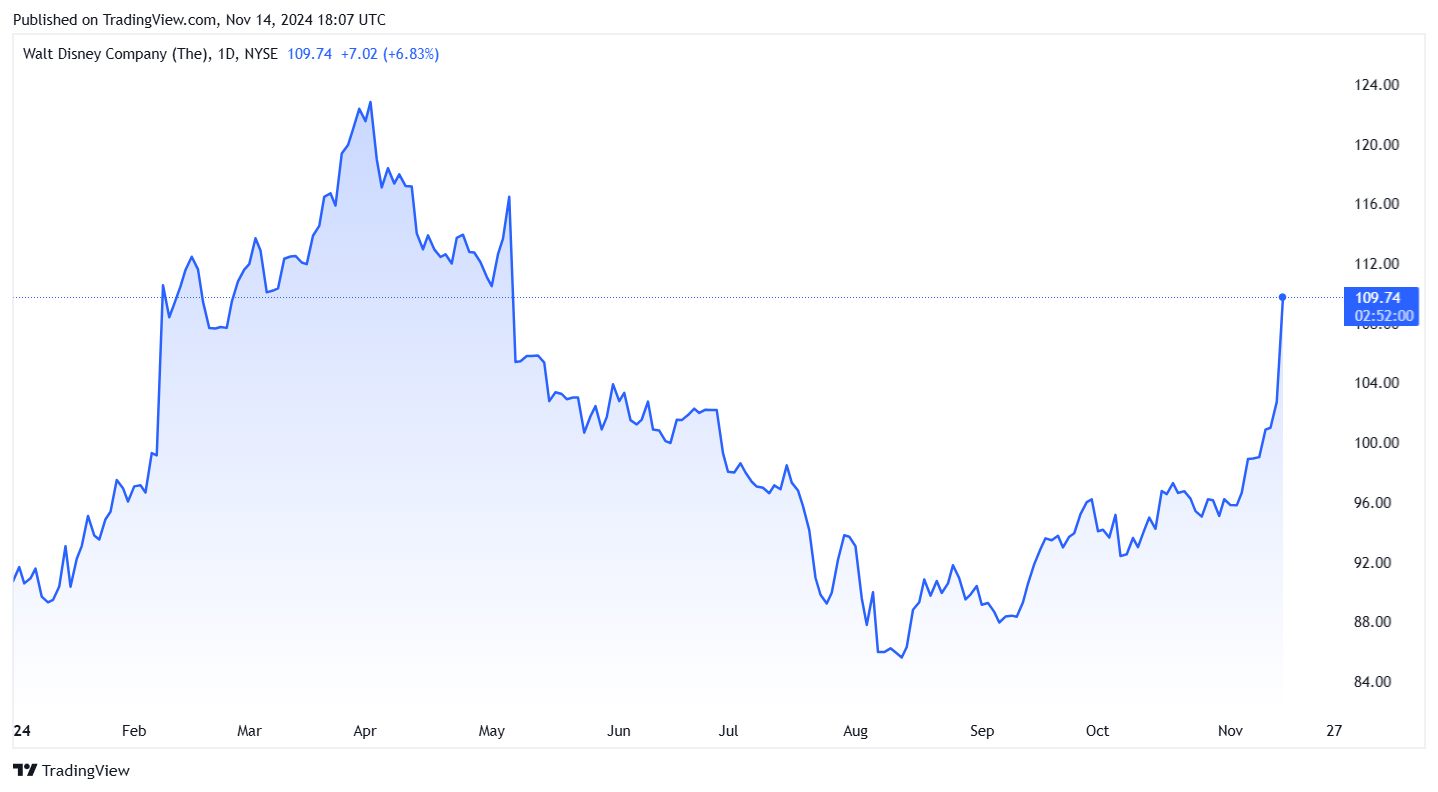 Akcie spoločnosti Disney (NYSE: DIS) vo štvrtok vzrástli o 7 % po tom, ako firma reportovala lepšie než očakávané kvartálne výsledky a prekvapila pozitívnym výhľadom na nasledujúce tri roky. Akcie Disney v čase publikovania tohto článku pridávajú približne 7 % na 109,74 USD.