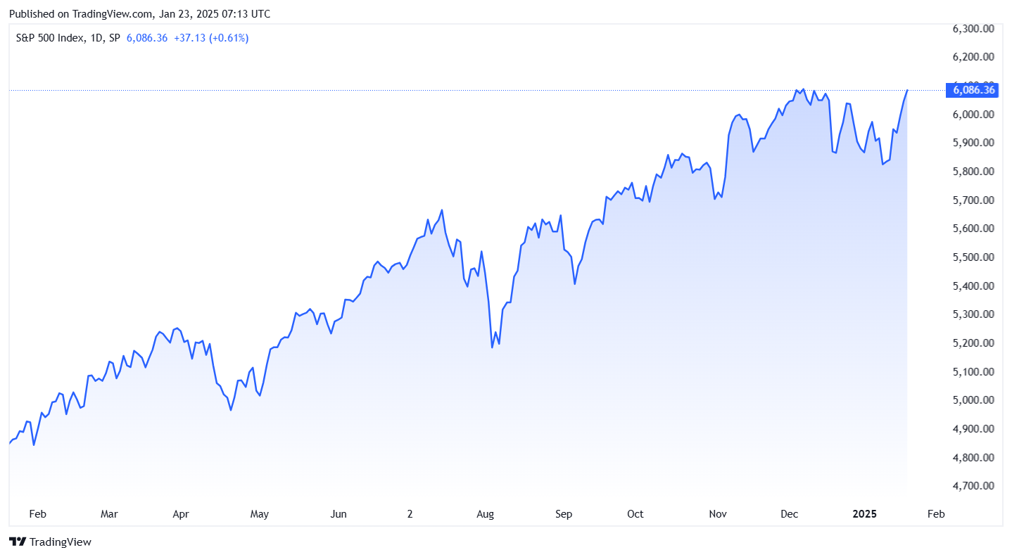 S&P 500 posilnil o 0,61 % na 6 086,37 po tom, ako dosiahol intradenný rekord 6 100,81. Prekonal tým predošlé maximum z decembra 2024.