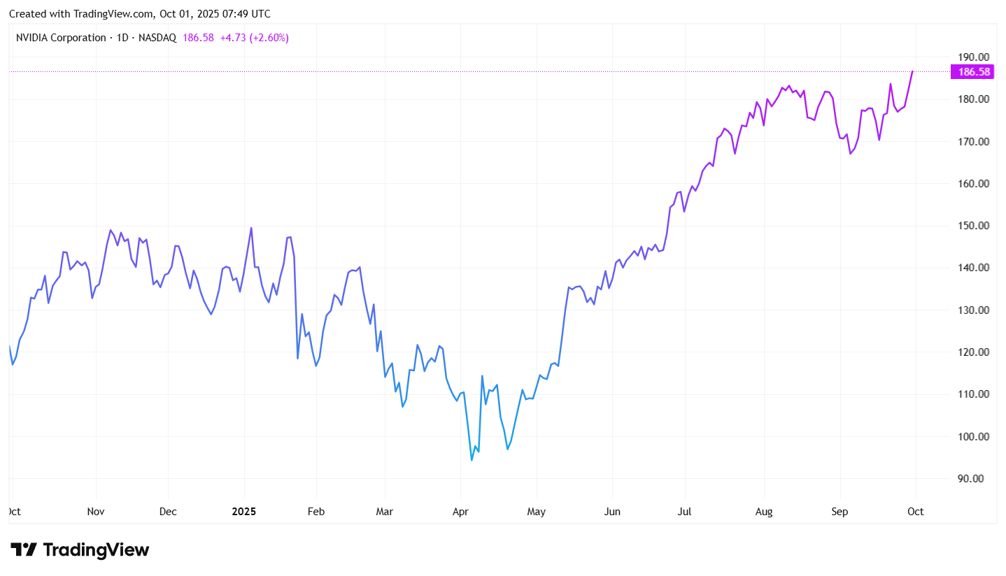 Akcie spoločnosti Nvidia v utorok posilnili o 2,6 % na 186,58 USD a dosiahli nové historické maximum. Trhová kapitalizácia výrobcu čipov tak prekročila hranicu 4,5 bilióna dolárov. Od začiatku roka sa hodnota akcií zvýšila približne o 39 %, pričom dopyt investorov neutícha. Nvidia totiž neustále rozširuje portfólio kontraktov a upevňuje si postavenie lídra v oblasti umelej inteligencie.