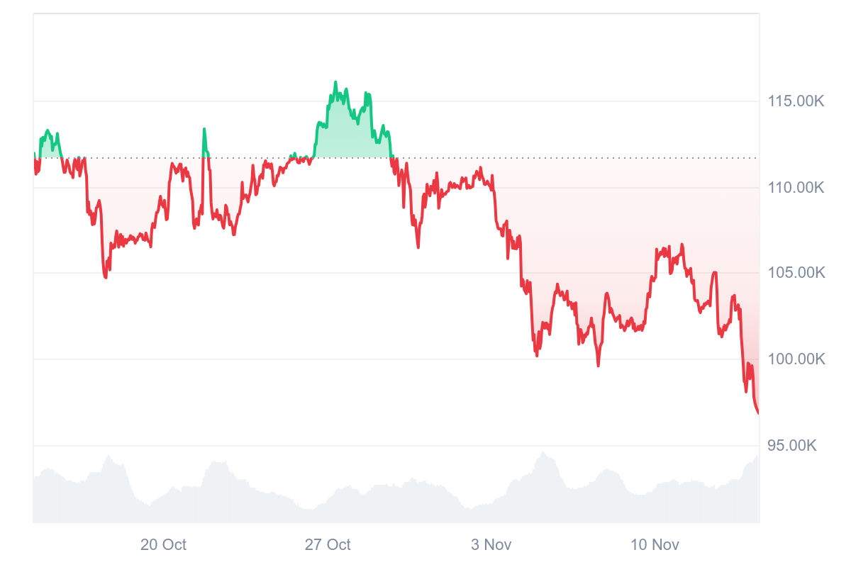 Úvod»Kryptomeny»Otrasy na kryptotrhu: Bitcoin klesol pod 97-tisíc USD